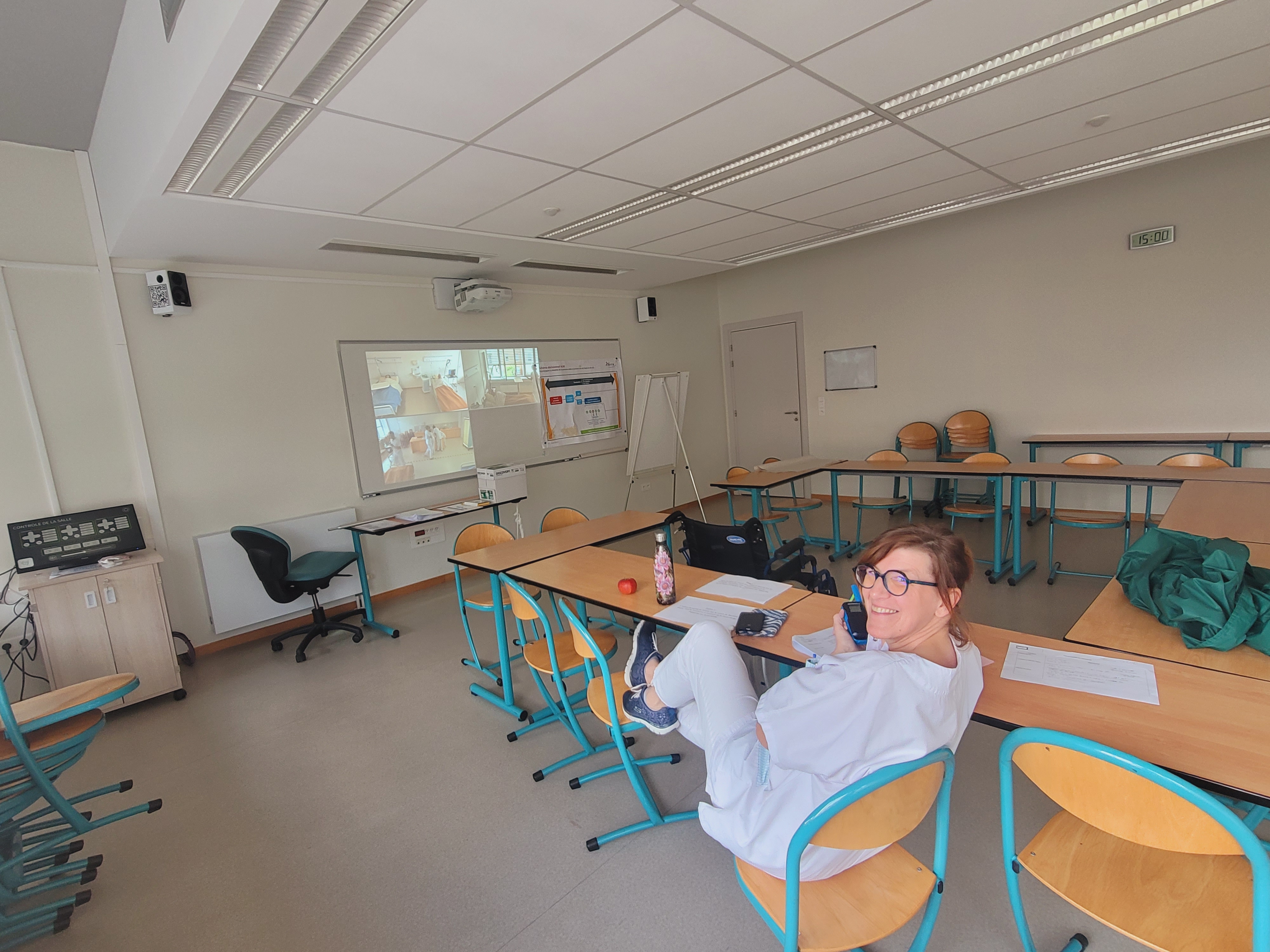 Inspirée du concept de la chambre des erreurs, cette activité invite les participants à repérer tout ce qui peut influencer le bien-être du patient : une débit mal programmé, un pansement non occlusif, une trace de confiture au coin de la bouche, ou encore la présence d’un drap à usage unique laissé sous la personne.