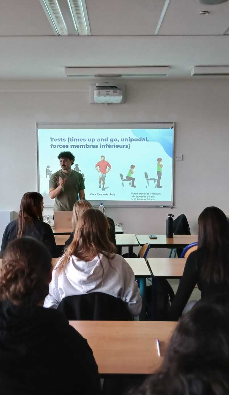 « Bouger au quotidien », guidé par un éducateur en activité physique adaptée qui a mis les étudiants en activité en proposant différents exercices, permettant de découvrir concrètement comment adapter l’activité physique aux besoins et capacités des patients