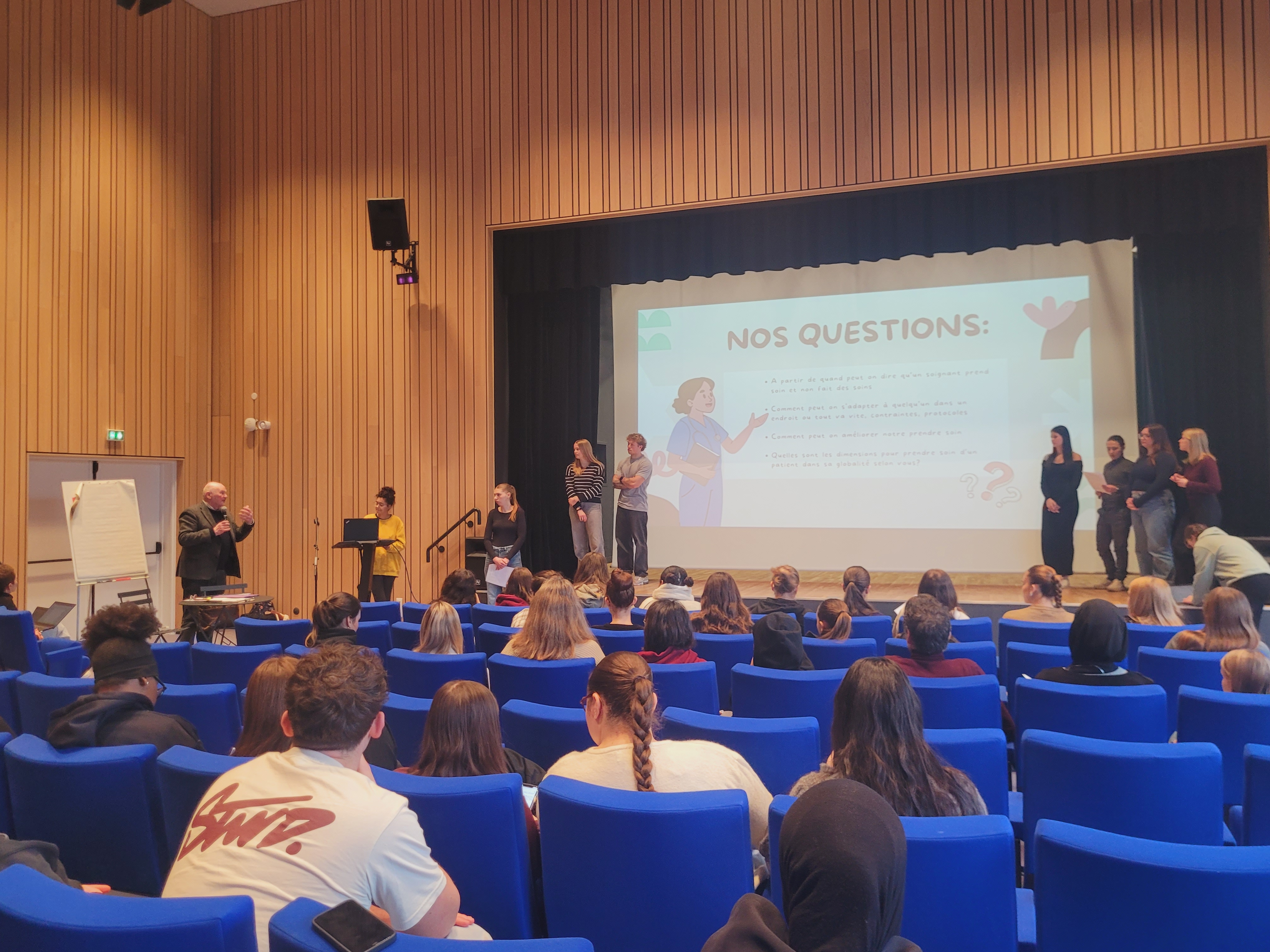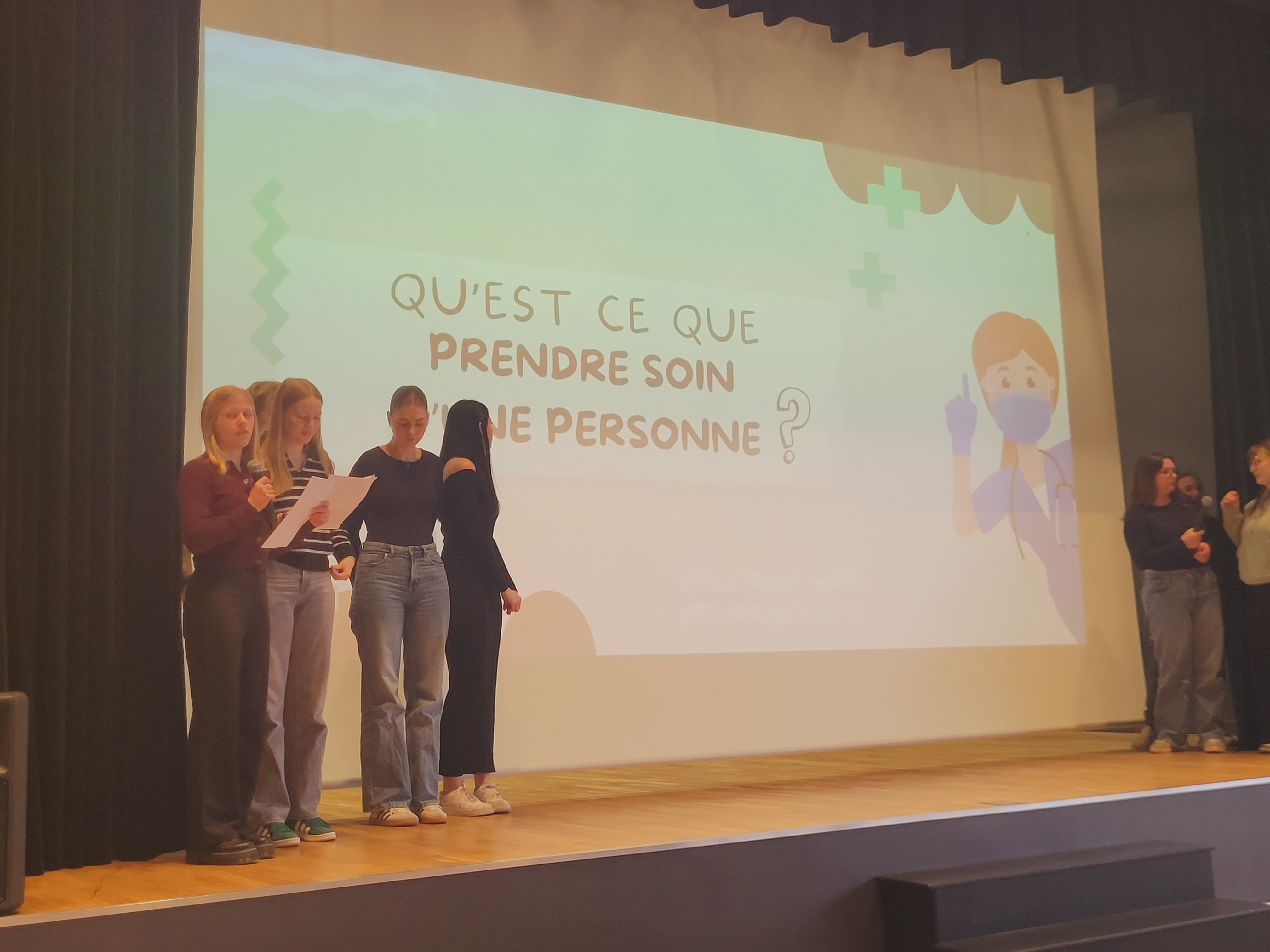 Les échanges se sont poursuivis par une présentation consacrée à la démarche de soins, envisagée à la lumière du prendre soin. Les étudiants ont mis en évidence l’importance d’une approche relationnelle et holistique, prenant en compte la personne soignée dans sa singularité et en l’impliquant activement dans le soin qui lui est apporté. La démarche de soins apparaît comme un outil évolutif et réflexif, essentiel à une pratique professionnelle respectueuse, sécurisée et adaptée. Walter Hesbeen a rappelé que rentrer en relation avec une personne relève d’une véritable démarche : elle ne se décrète pas, elle se construit. Il a également souligné que la démarche de soins constitue avant tout une posture professionnelle. Prendre soin implique de reconnaître ce qui est important pour la personne et de construire, dans la durée, une relation de confiance.