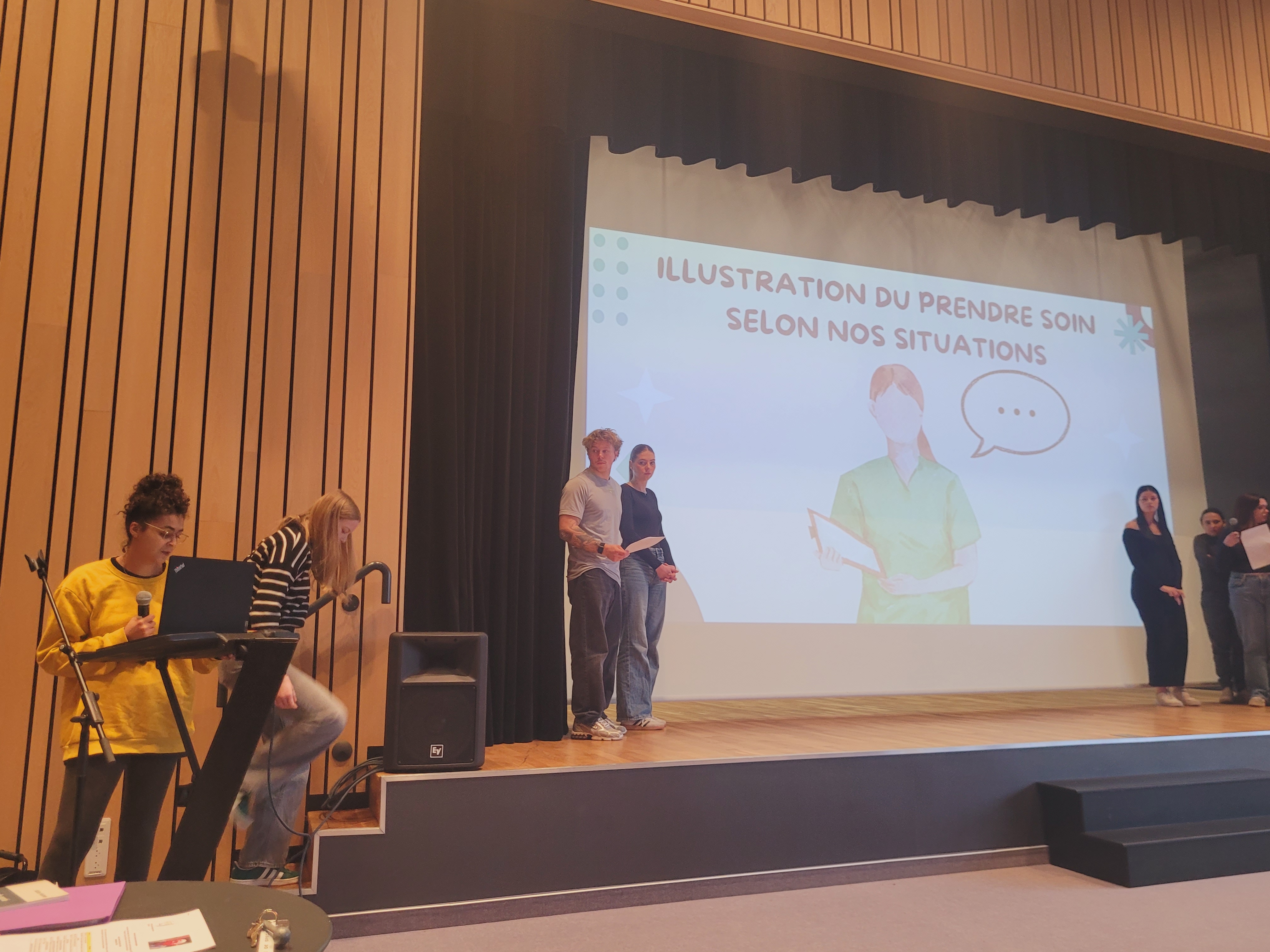 Le dernier groupe a présenté la distinction entre le soin, les soins, faire des soins et prendre soin, en rappelant l’importance de s’adapter à la personne en faisant avec et non pour. Walter Hesbeen a souligné que soigner et prendre soin ne sont pas synonymes : il est possible de soigner sans véritablement prendre soin. Il a également attiré l’attention sur le recueil de données, qui peut parfois se transformer en une succession de questions laissant peu de place à ce que la personne souhaite réellement partager.
